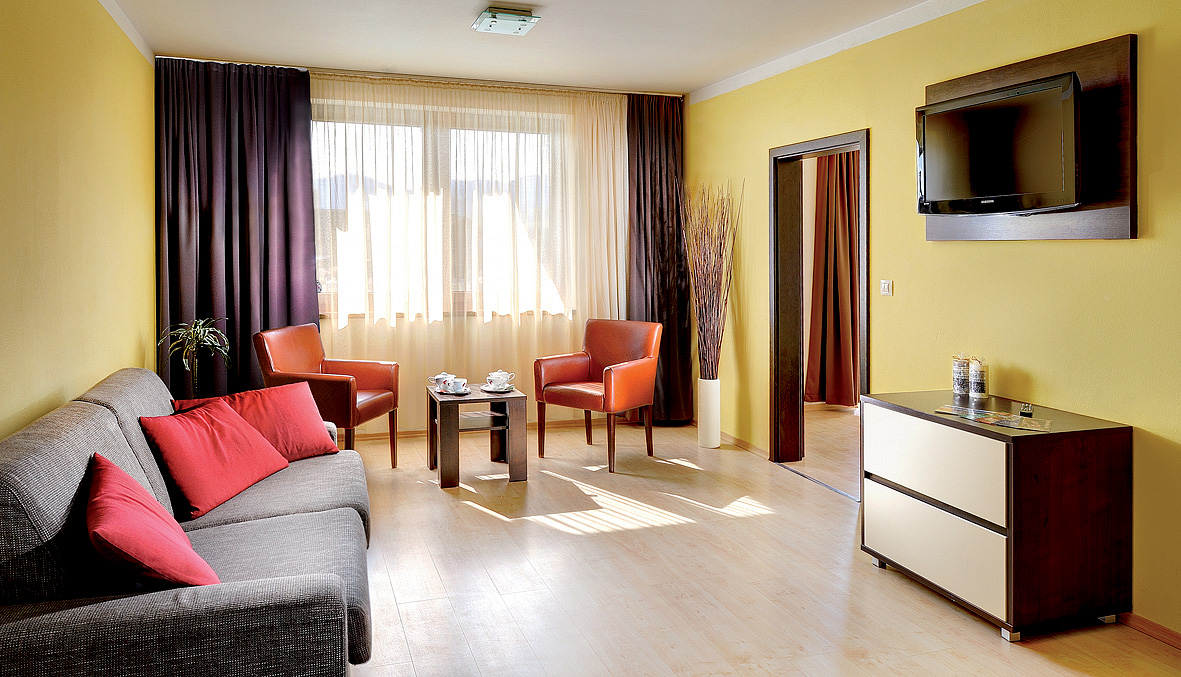 ložnice s manželskou postelí, obývací pokoj s rozkládacím gaučem pro 2 osoby, sociální zařízení se sprchou či vanou, zpravidla balkon s výhledem do vodního parku