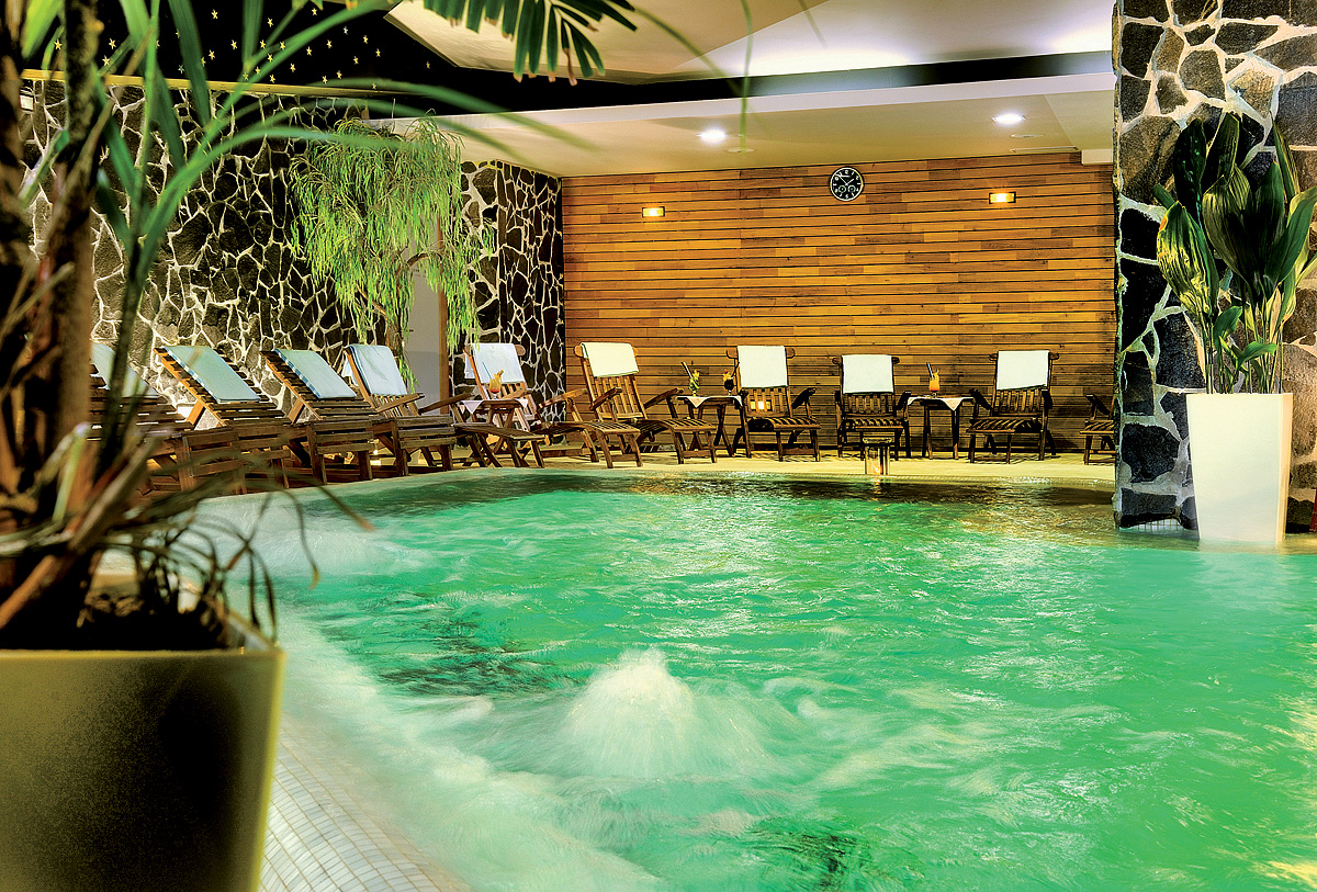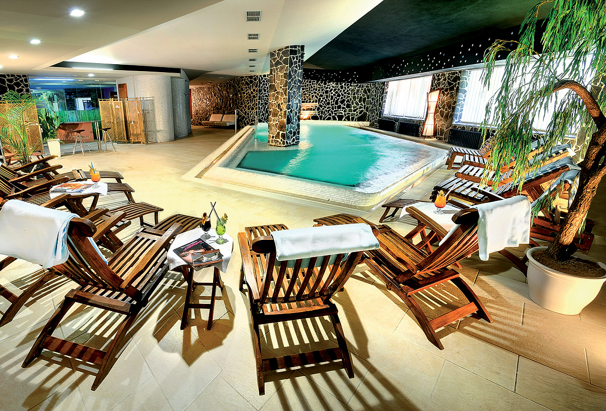 bazén# 12 x 6 m s masážními tryskami, 2x venkovní vířivka# až pro 6 osob, finská sauna#, 2x venkovní finská sauna#, aroma sauna#, pára# se solí, infrakabina#, hydromasážní sprcha#, relaxační koutek# s lehátky, masáže*, kosmetické služby*, biliár*, stolní fotbal*, stolní hokej*; služby označené # mohou využívat děti do 12 let jen v doprovodu dospělé osoby a jen do 19.00 hod.; v rámci relaxačního centra jsou zdarma nabízeny též ručníky a prostěradla