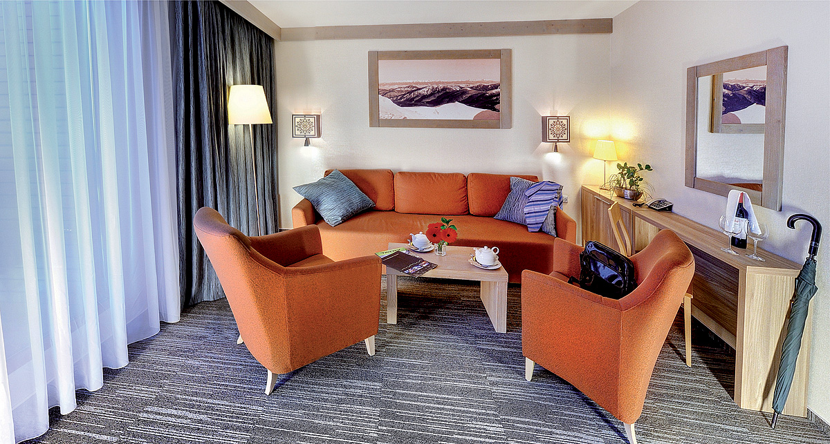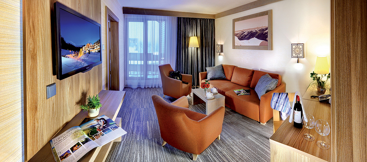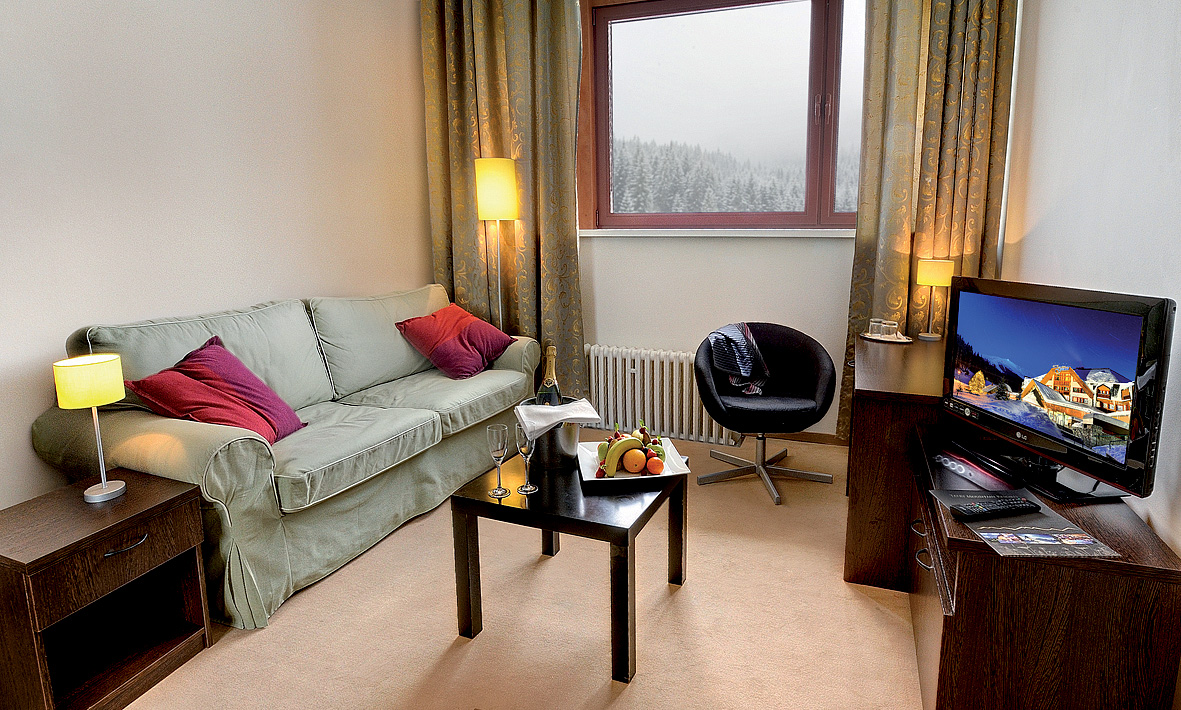 prostornější pokoj, ložnice s manželskou postelí či 2 samostatnými lůžky, obývací pokoj s rozkládacím gaučem pro 2 osoby, sociální zařízení
