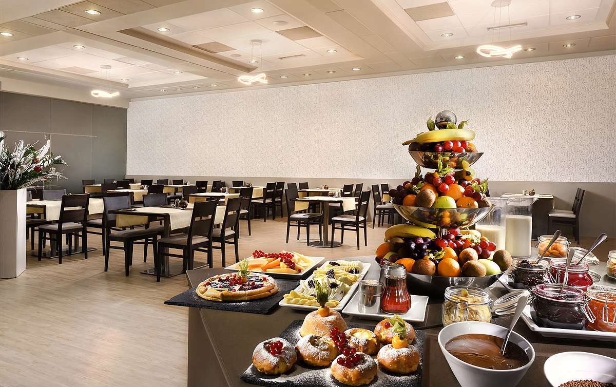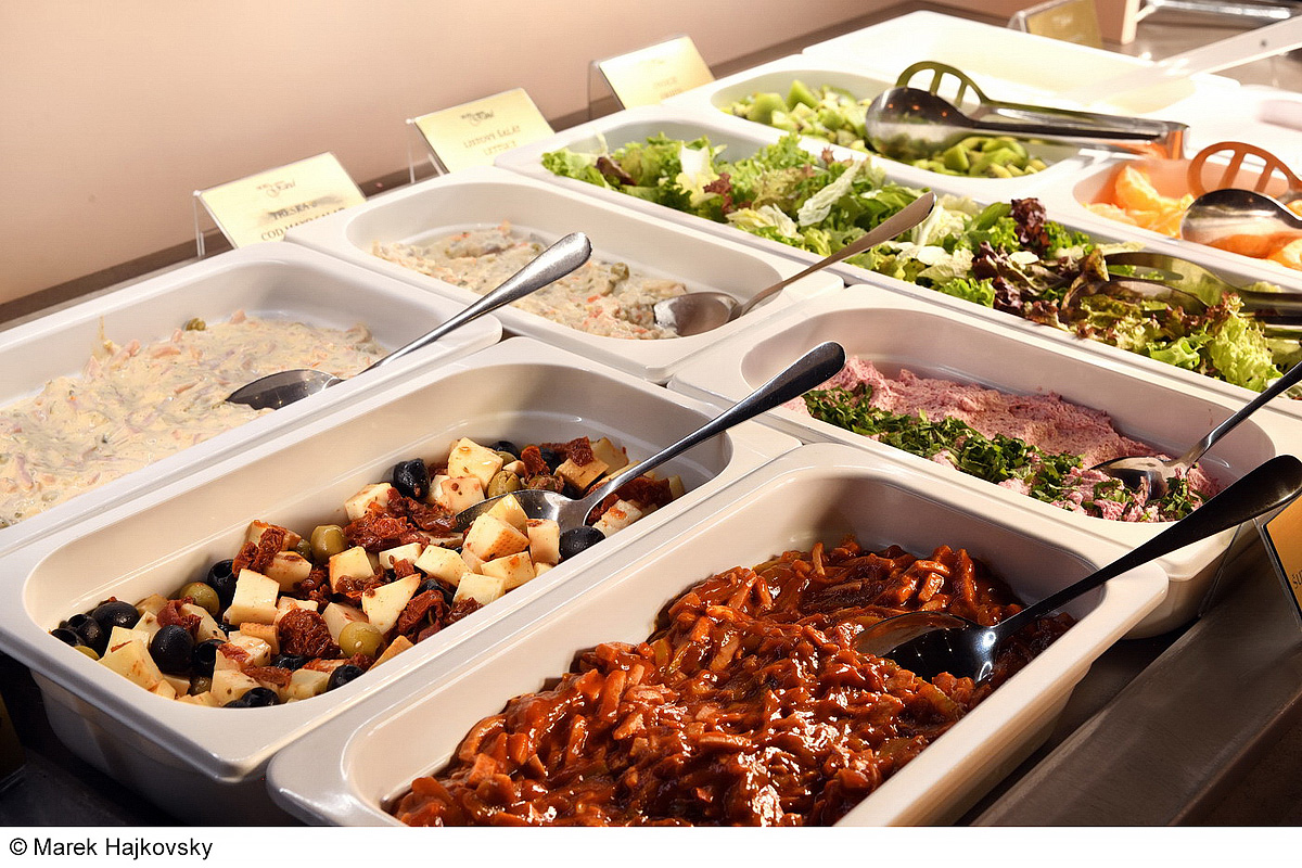servírované menu s výběrem ze 3 až 4 hlavních jídel s přílohou, salátový bufet, servírovaný dezert, nápoje za poplatek