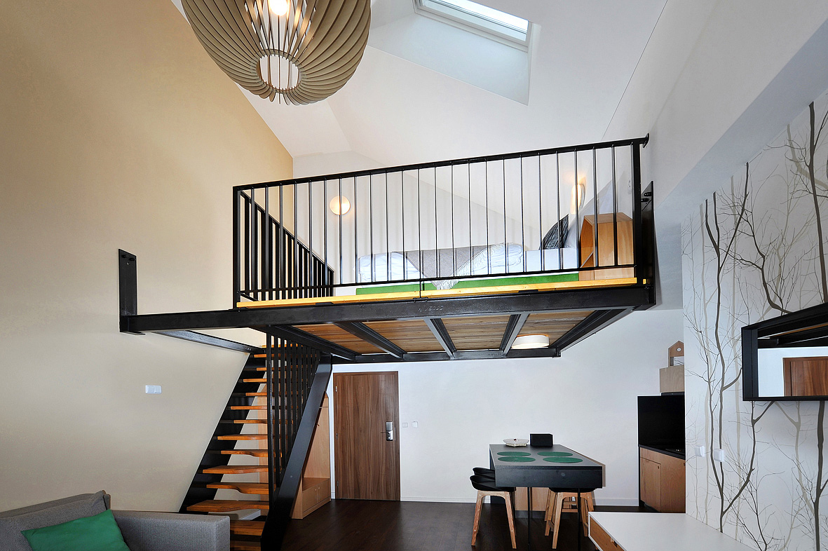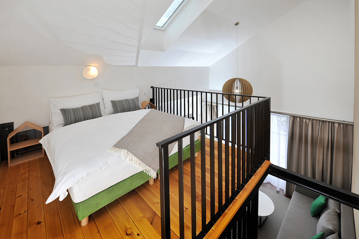 50 m² - 1 ložnice s manželskou postelí, obývací pokoj s kuchyňským koutem a rozkládacím gaučem pro 2 osoby, neuzavřené zvýšené patro v rámci obývacího pokoje s manželskou postelí, sociální zařízení, balkon