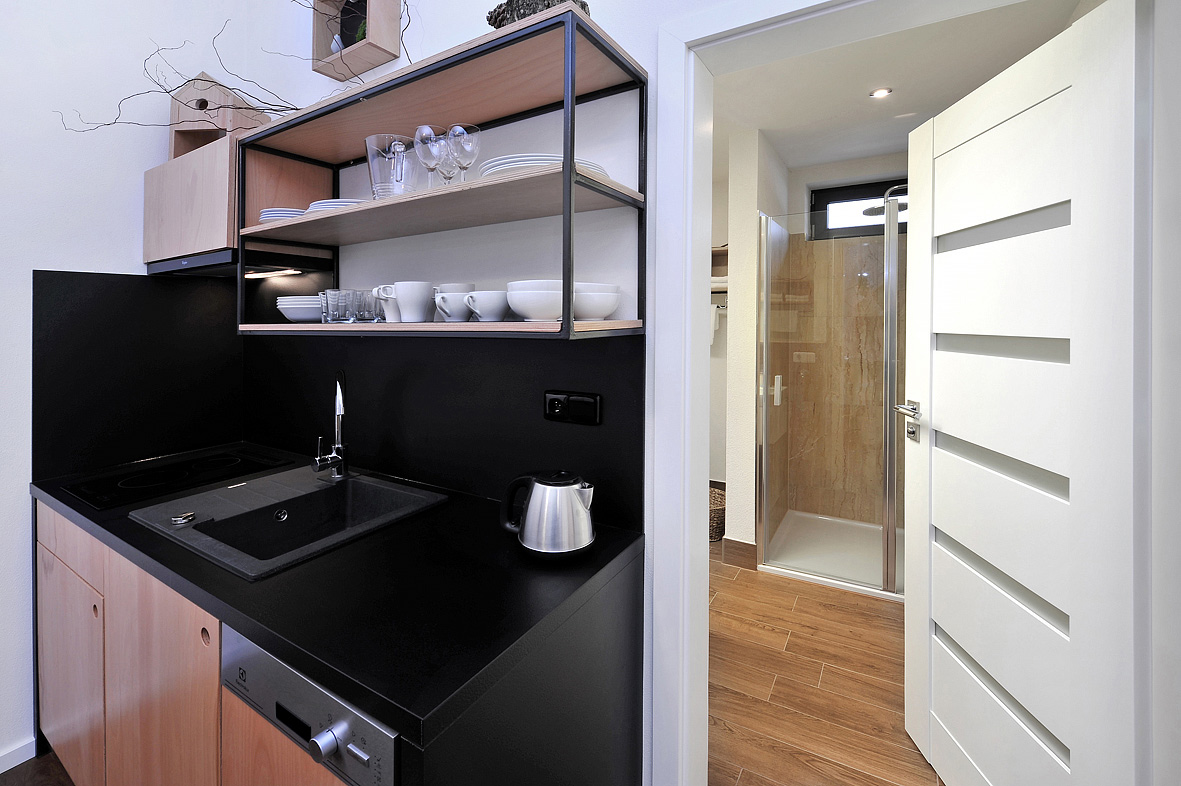 35 m² - 1 ložnice s manželskou postelí, obývací pokoj s kuchyňským koutem a rozkládacím gaučem pro 2 osoby, sociální zařízení, některé apartmány s balkonem