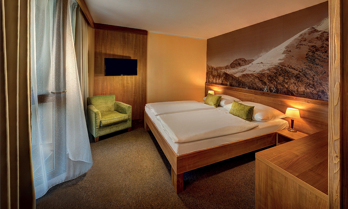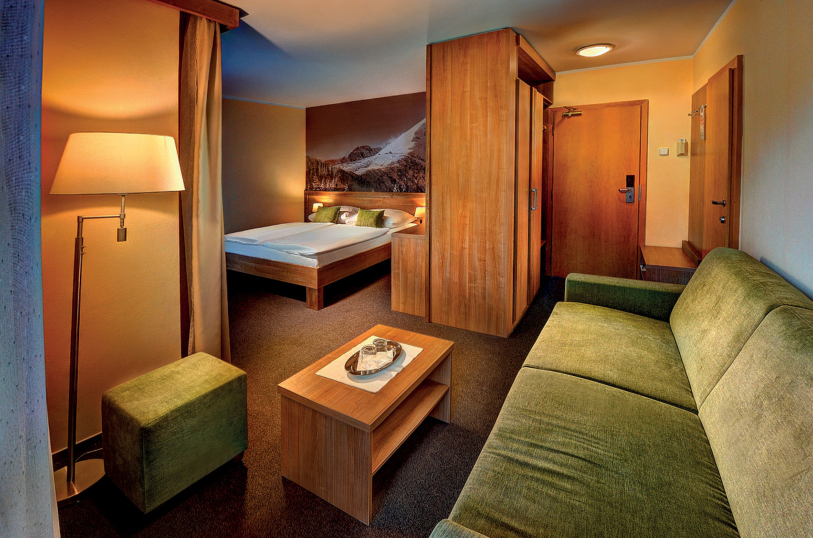 25 m² - pokoj s manželskou postelí a částečně odděleným rozkládacím gaučem pro 2 osoby, sociální zařízení se sprchou či vanou, z 50 % balkon (některé pokoje řešené jako prostorná ložnice, jiné jako dva propojené pokoje)