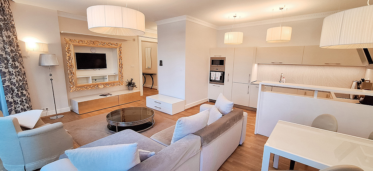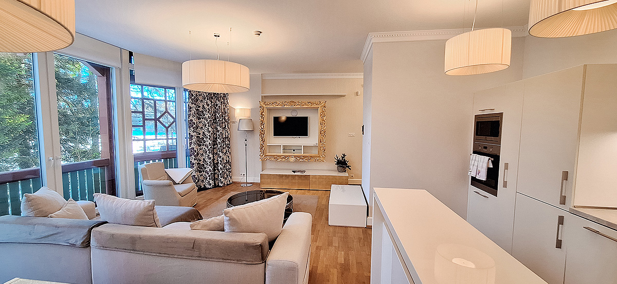 ložnice s manželskou postelí, obývací pokoj s rozkládacím gaučem pro 2 osoby, kuchyně s jídelním stolem, sociální zařízení s vířivou vanou