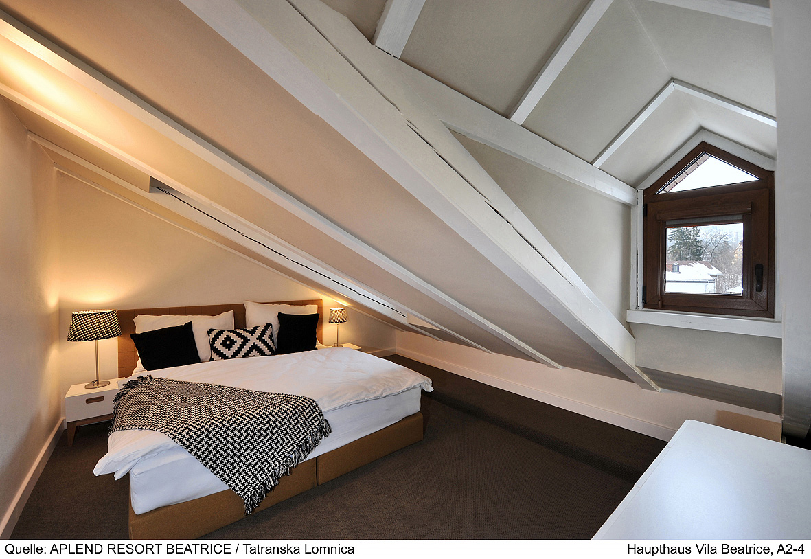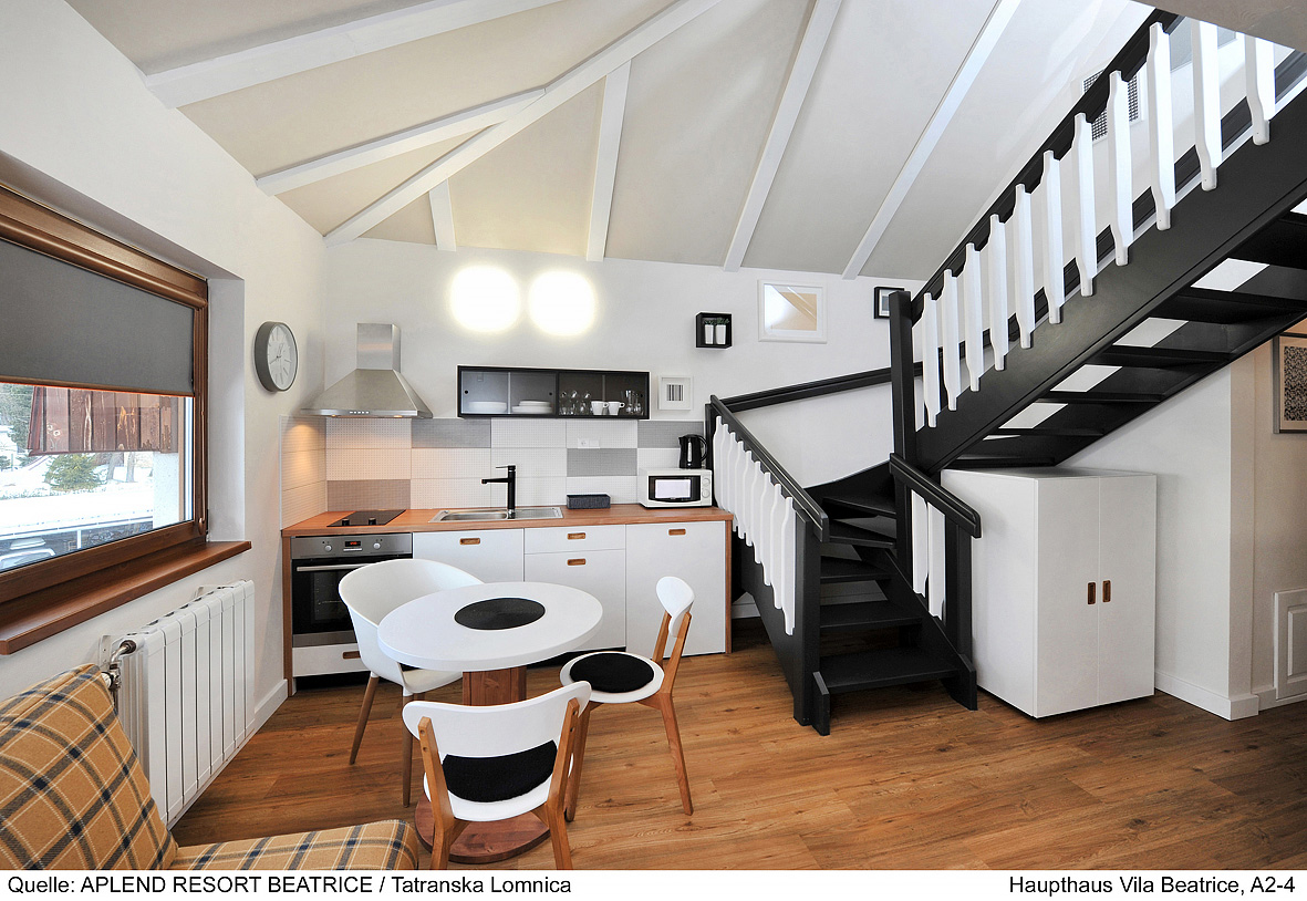 100 m² - dvoupodlažní apartmán: 1. patro: ložnice s 2 oddělitelnými lůžky, obývací pokoj s gaučem a kuchyňským koutem s el. troubou, sociální zařízení se sprchou; 2. patro: 3 ložnice s manželskou postelí, sociální zařízení se sprchou či vanou, finská suna, panoramatický balkon