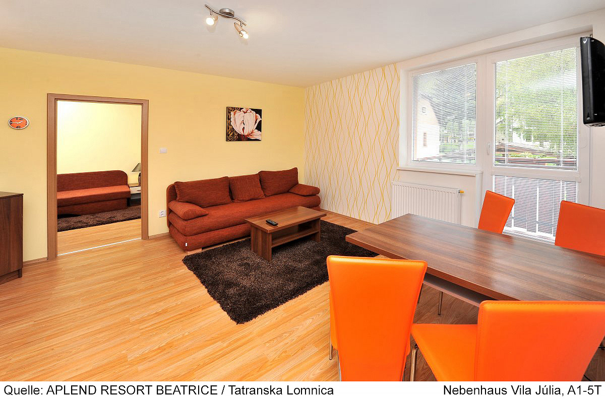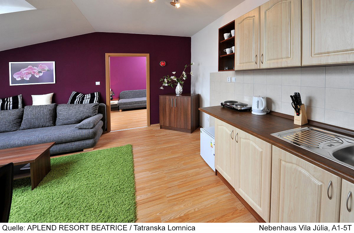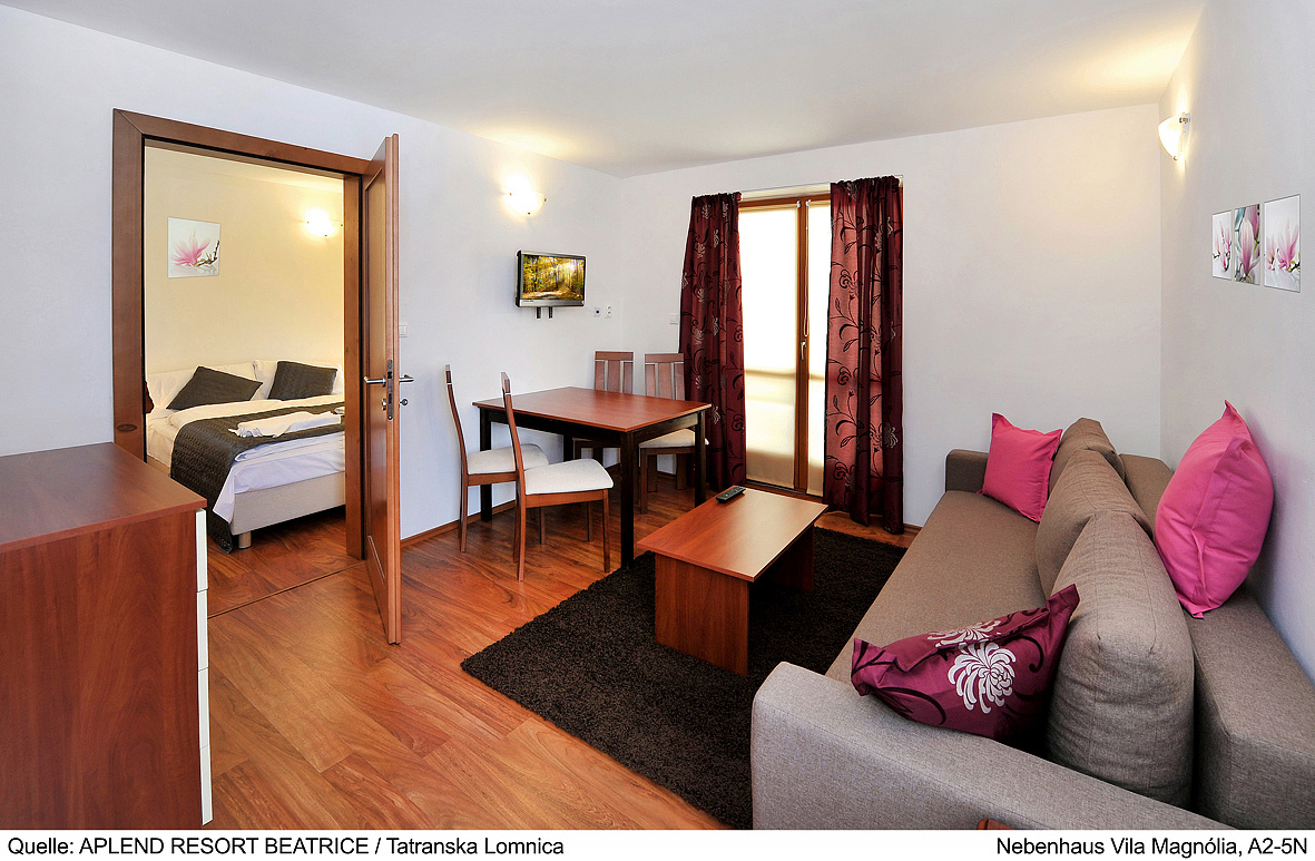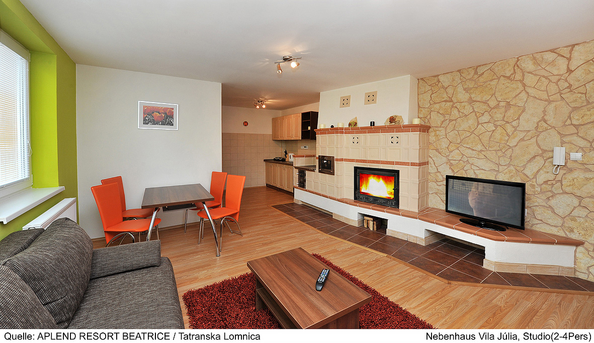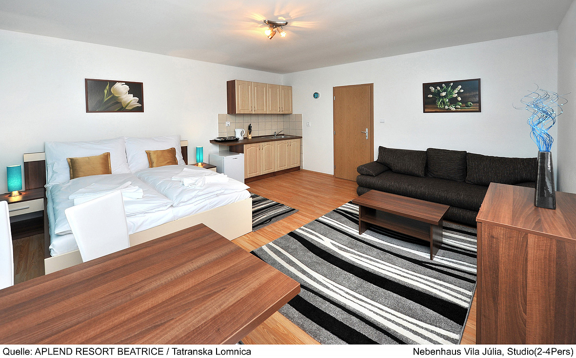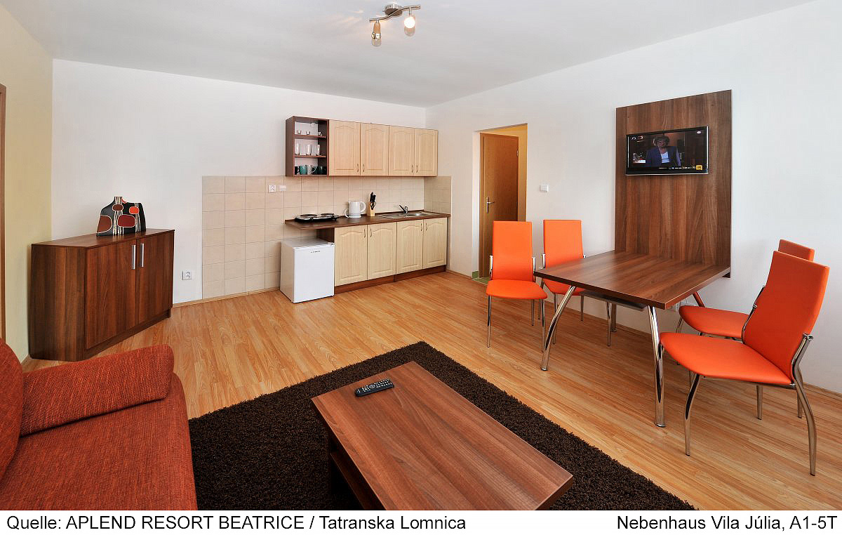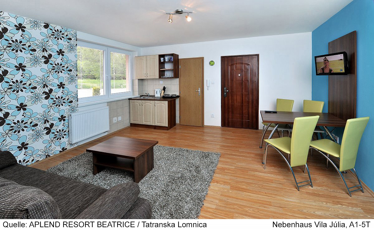 25 m² - obývací pokoj s manželskou postelí a rozkládacím gaučem pro 2 osoby, kuchyně, jídelní kout, sociální zařízení se sprchou; všechny apartmány se nachází v přízemí