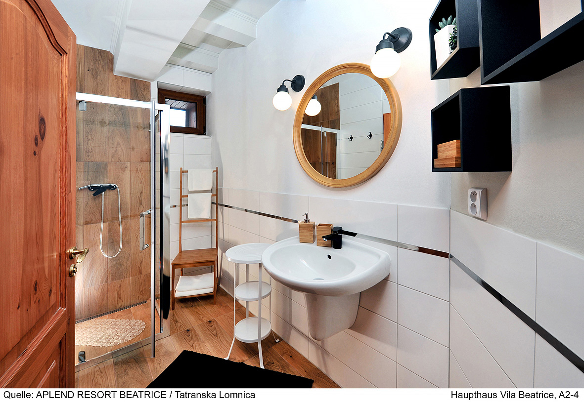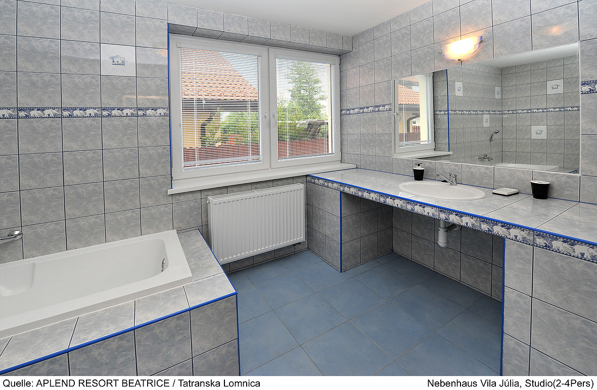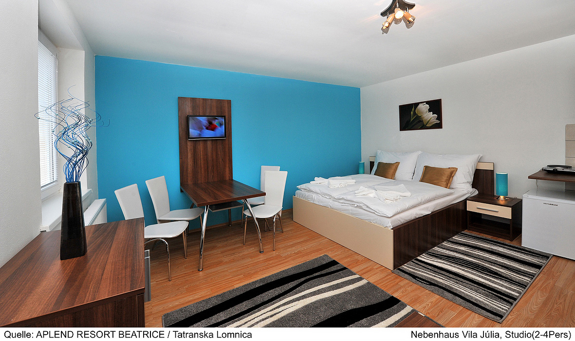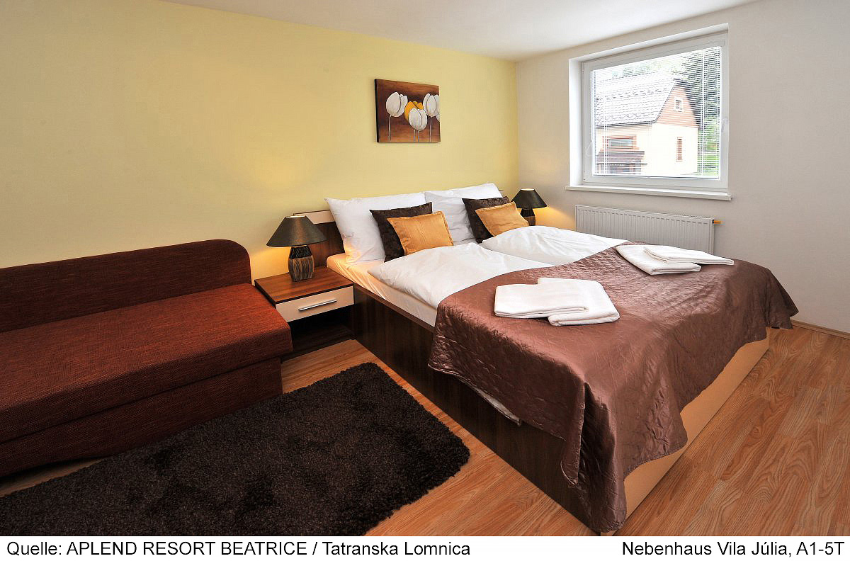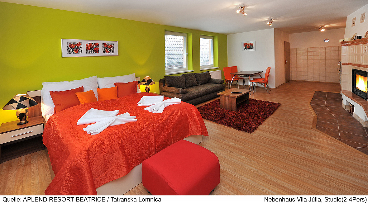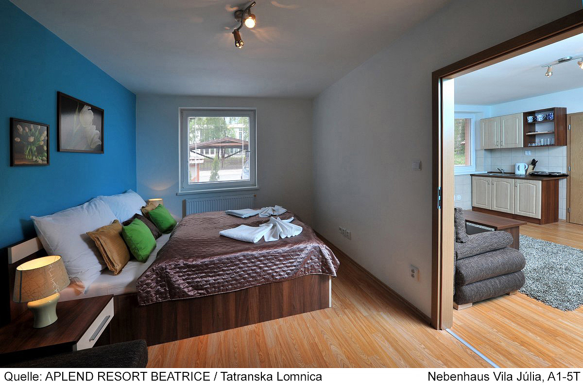 25 m² - obývací pokoj s manželskou postelí a rozkládacím gaučem pro 2 osoby, kuchyně, jídelní kout, sociální zařízení se sprchou; všechny apartmány se nachází v přízemí