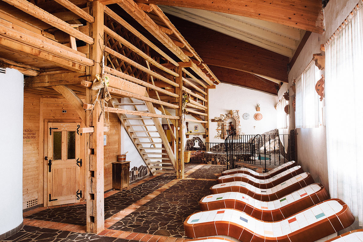 K dispozici je i několik masážních vířivek a k odpočinku láká i prosklená zimní zahrada s lehátky.