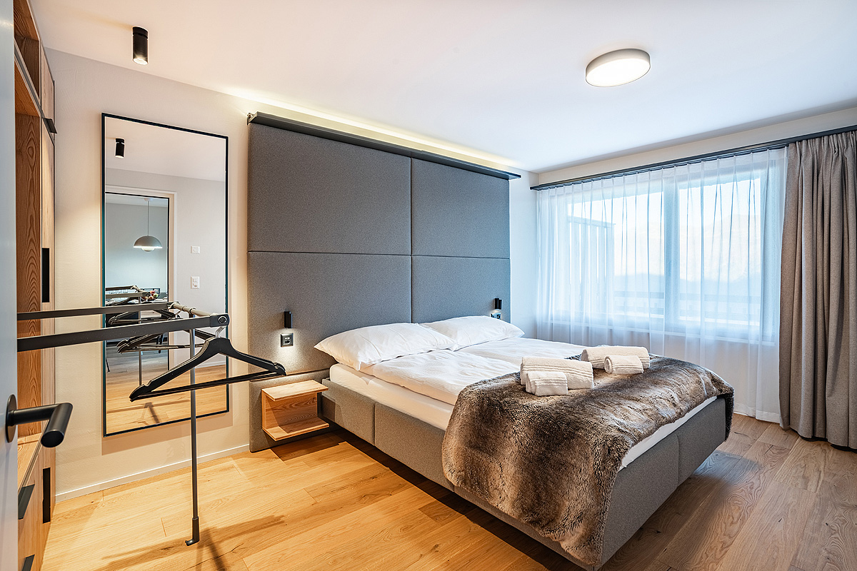 45 až 48 m² - 1 ložnice s manželskou postelí (160x200 cm), obývací pokoj s kuchyňským koutem a rozkládacím gaučem (šíře 160 cm) pro 2 osoby, sociální zařízení