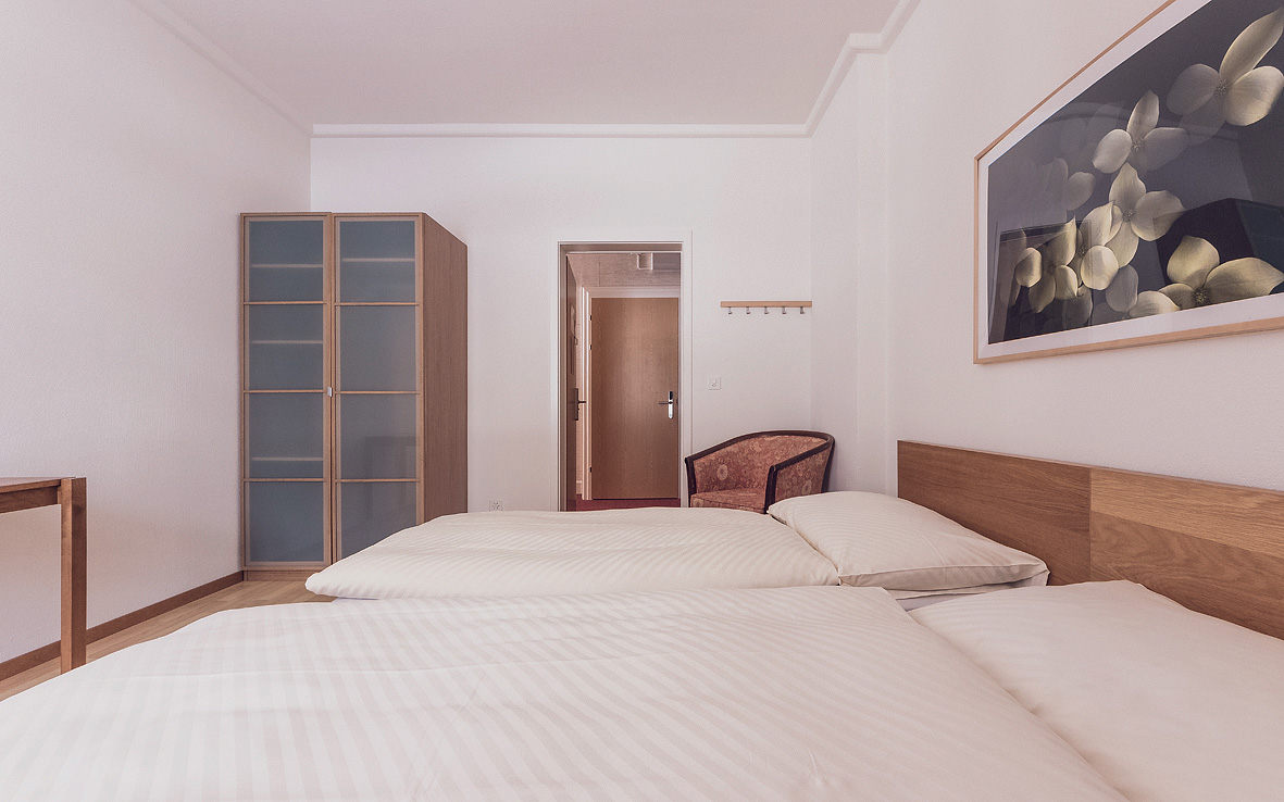 pokoj s manželskou postelí a dalším 1 samostatným lůžkem či 3 samostatnými lůžky či palandou a 1 samostatným lůžkem, sociální zařízení (jen umyvadlo), zpravidla balkon či terasa; minimální obsazenost pokoje jsou 3 osoby