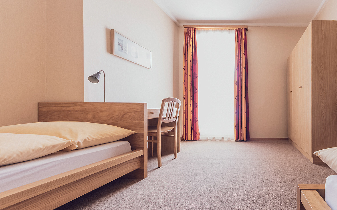 pokoj s manželskou postelí či 2 samostatnými lůžky, sociální zařízení (jen umyvadlo), zpravidla balkon či terasa