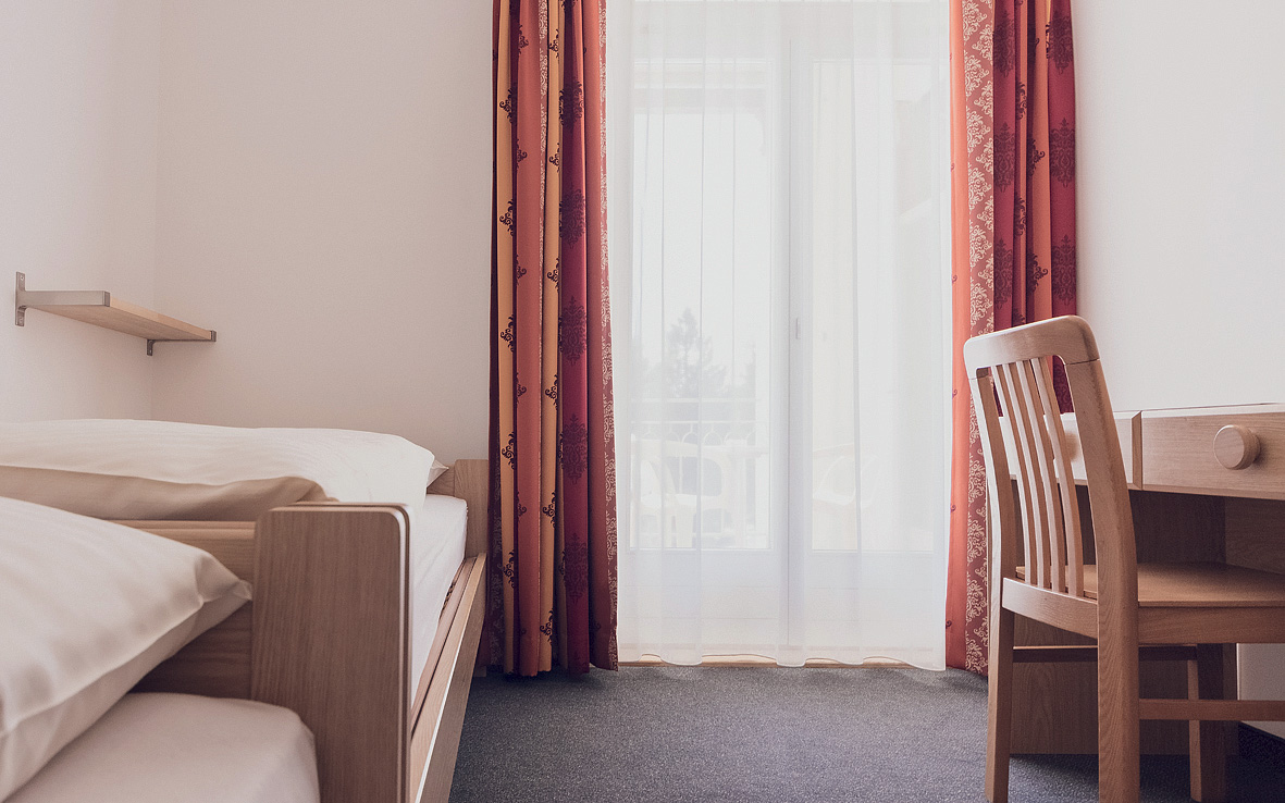 pokoj s 1 samostatným lůžkem, sociální zařízení (jen umyvadlo), zpravidla balkon či terasa