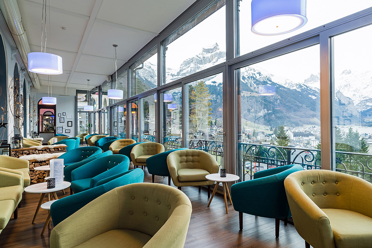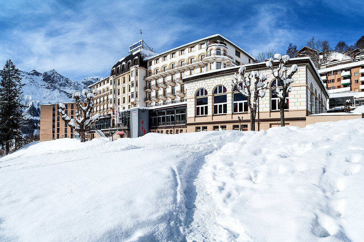 hotel je tvořen hlavní (původní) a vedlejší budovou, které jsou vzájemně propojeny; obě budovy se nachází ve svahu nad střediskem Engelberg; hotel je přístupný buď po silnici (velké stoupání, v zimě často nutnost použít sněhové řetězy) či hotelovým tunelem a výtahem vedoucím až do hotelového lobby; vstup do tunelu ústícího k hotelovému výtahu je přímo u venkovního parkoviště dole ve středisku; uvedené vzdálenosti jsou měřeny od začátku hotelového tunelu