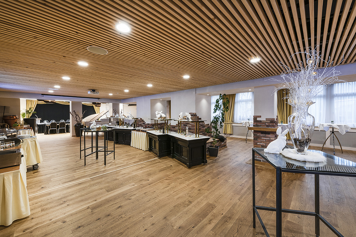 formou bufetu či servírovaného 3chodového menu s výběrem studených předkrmů či polévek, salátů, 2 hlavních jídel, příloh, dezertů; kohoutková voda a 1x 0,2 l rozlévaného červeného či bílého vína během večeře, ostatní nápoje za poplatek