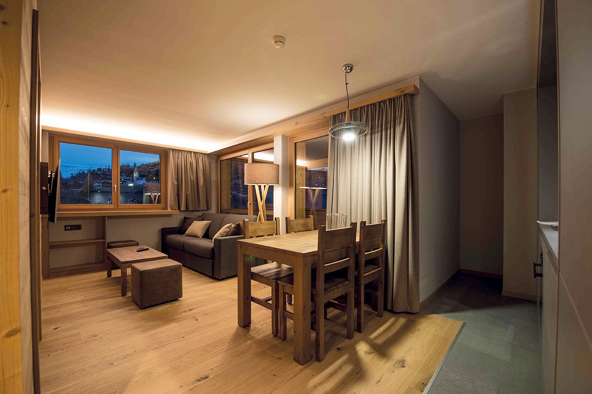 72 m² - 2 ložnice se 2 samostatnými lůžky, obývací pokoj s kuchyňským koutem a 2 rozkládacími gauči (šířka 160 cm) pro 2 osoby každý, 2x sociální zařízení, oddělené WC; apartmán má 2 patra